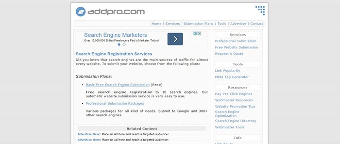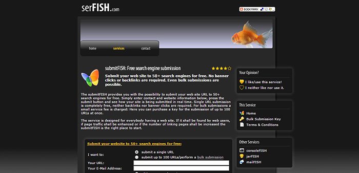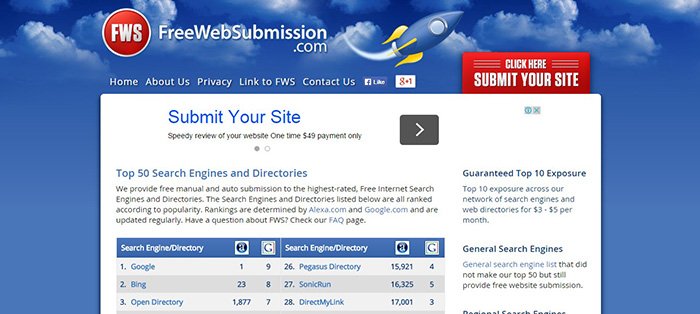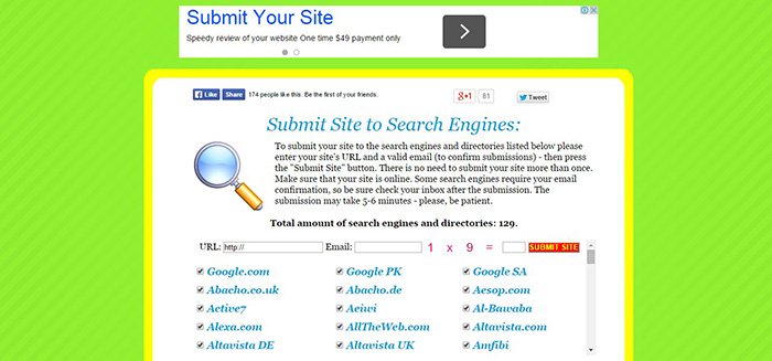Situs web ini memungkinkan anda untuk memperkenalkan ke lebih dari 50 mesin pencari. Untuk melakukannya anda tidak diharuskan memasang backlink atau klik banner. Keunggulan lainnya anda dapat melakukan submission masal.