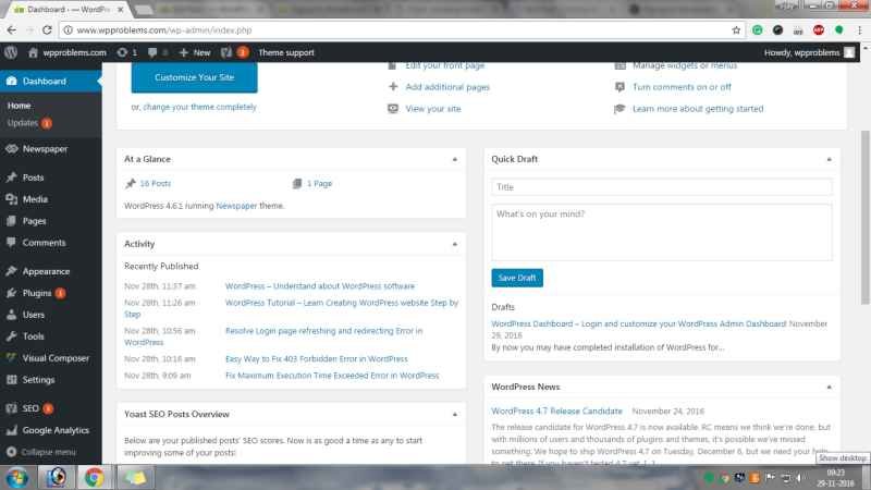 Sebuah halaman back-end yang berisi semua fasilitas dari cms, Dashboar hanya bisa diakses oleh admin maupun user yang diberi ijin khusus mengaksesnya. Pada wordpress sendiri isi dari dashboard meliputi :