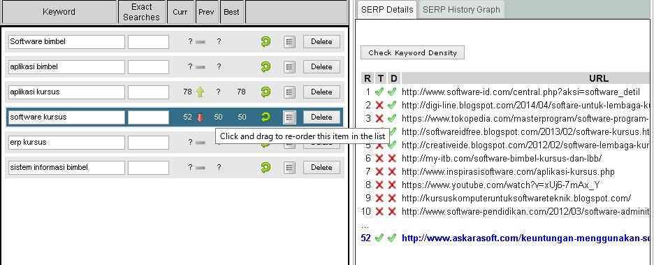 Dari semua keyword yang ditargetkan hanya keyword aplikasi kursus dan software kursus lah yang masuk peringkat, sedangkat lainnya tidak masuk dalam 300 besar peringkat google