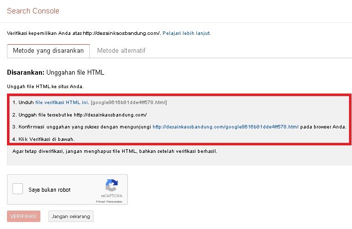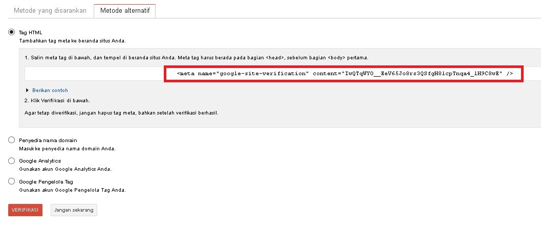 Untuk situs web baru yang menggunakan google webmaster biasanya diharuskan menggunakan verifikasi tambahan. Jika muncul seperti gambar diatas caranya tidak begitu sulit. Ada banyak cara yang bisa anda lakukan, namun saya hanya menguraikan 3 sampel saja, alternatif memasangkan script verifikasi yang bisa anda lakukan (pilih salah satu saja) :