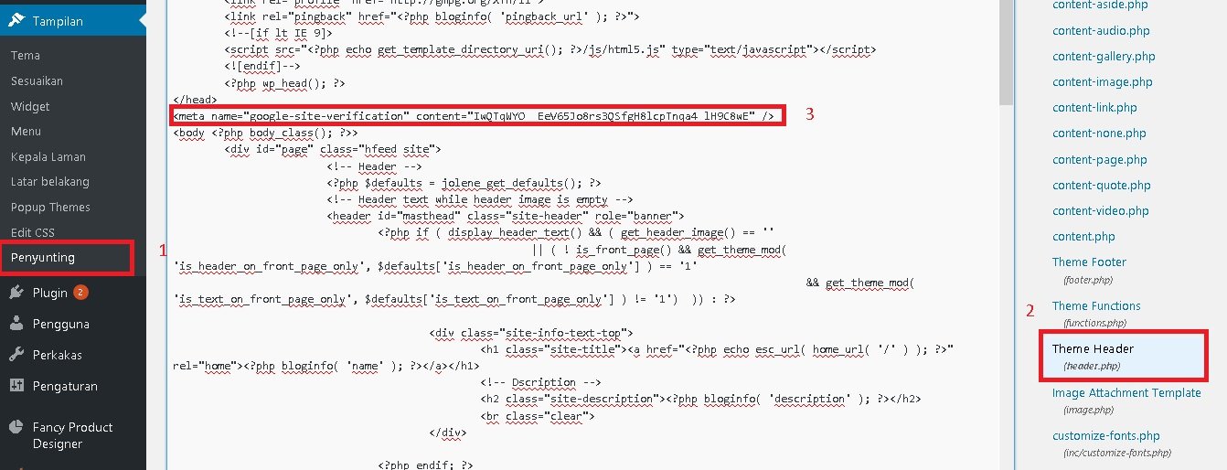 Jika anda menggunakan wordpress bisa memasang “meta name” melalui tampilan >>> penyunting >>> theme header. Kemudian masukan seperti cara alternatif verifikasi no 1, script verifikasi sesudah </head>, sebelum <body. Hal ini pun bisa dilakukan jika anda menggunakan Cms lainnya baik opensource maupun close source.