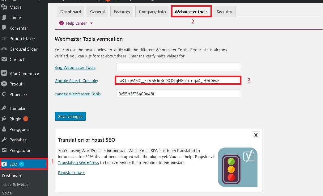 Bagi anda yang menggunakan salah satu plugin penting wordpress, plugin SEO Yoast. Akan sangat diuntungkan. Selain dipermudah, melalui cara ini membuat website wordpress anda terhindar dari efek pembaharuan tema yang akan menghilangkan semua script dan kode yang tertanam pada semua bagian tema. Caranya adalah dengan klik tab SEO pada dashboard >>> Webmaster tools >>> masukan kode script “meta name” pada kolom google search console. Andapun dapat melakukan hal yang sama pada akun webmaster lainnya seperti bing dan yandex.