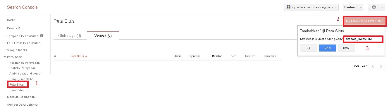 Anda harus kembali ke halaman google webmaster tab perayapan (crawl) >>> peta situs (sitemap) >>> tambahkan peta situs (add sitemap) >>> masukan “sitemap_index.xml” yang tadi anda kopi kemudian kirim (submit). Anda juga bisa mengujunya terlebih dahulu sebelum di submit. Setelah langkah submit sitemap selesai atatusnya akan “pending”, waktu penantian sitemap anda di terima google bisa cepat atau lambat, terkadang beberapa menit terkadang berhari2 (jika menurut anda terlalu lama maka bisa lakukan proses resubmit dengan konsekuensi antrian dimulai dari awal, atau dengan cara meminta bantuan di forum bantuan webmaster).