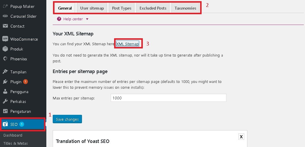 Sebelum memasukan sitemap anda pada google webmaster, anda wajib membuat sitemap website terlebih dahulu. Saya anggap plugin Yoast SEO terpasang di website. Selain Yoast SEO, plugin google sitemap generator pun bisa digunakan, atau jika anda mampu, buat saja secara manual. Caranya, pilih tab SEO >>> atur tab-tab diatas jika mengerti dan paham, jika belum paham biarkan saja toh sudah terkonfigurasi standar (anda wajib mempelajarinya jika ada waktu luang dan jika sudah mengerti mengenai taxonomy) >>> save changes >>> klik tautan XML sitemap.