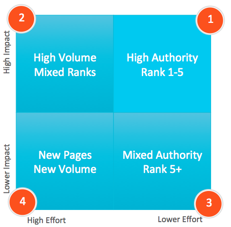Usaha (effort) yang tinggi akan mendatangkan trafik (impact) yang lebih tinggi, maka anda harus belajar caranya memenangkan persaingan pada kuadran 2. Jika anda berhasil pada kuadran 2 ditandai menjadi otoritas (peringkat 1 s/d 5 rata2 keyword niche anda dalam pencarian), maka anda sudah memasuki kuadran 1 yang lebih tinggi.
