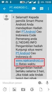 Ciri-ciri umumnya mudah dikenali yaitu memberi pemberitahuan memenangkan hadiah, undian dan sebagainya. Sebagian lagi emanfaatkan pura-pura membeli produk yang kita pasang di facebook, tokopedia, bukalapak dsb. Selain www.rejekiandroid.com mereka menggunakan banyak website dan blog seperti beberapa yang saya temukan menggunakan nama PT. REJEKI ANDROID CEO (sejenisnya) diantaranya :