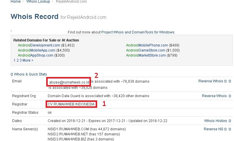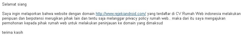 Pada gambar diatas terlihat bahwa rejekiandroid.com terdaftar di CV.RUMAHWEB INDONESIA, dengan demikian kita bisa mengirimkan email pengaduan pada point no 2 diatas. Atau bisa juga dengan mengunjungi penyedia server website yang dimaksud untuk meminta bantuan live chat customer service.